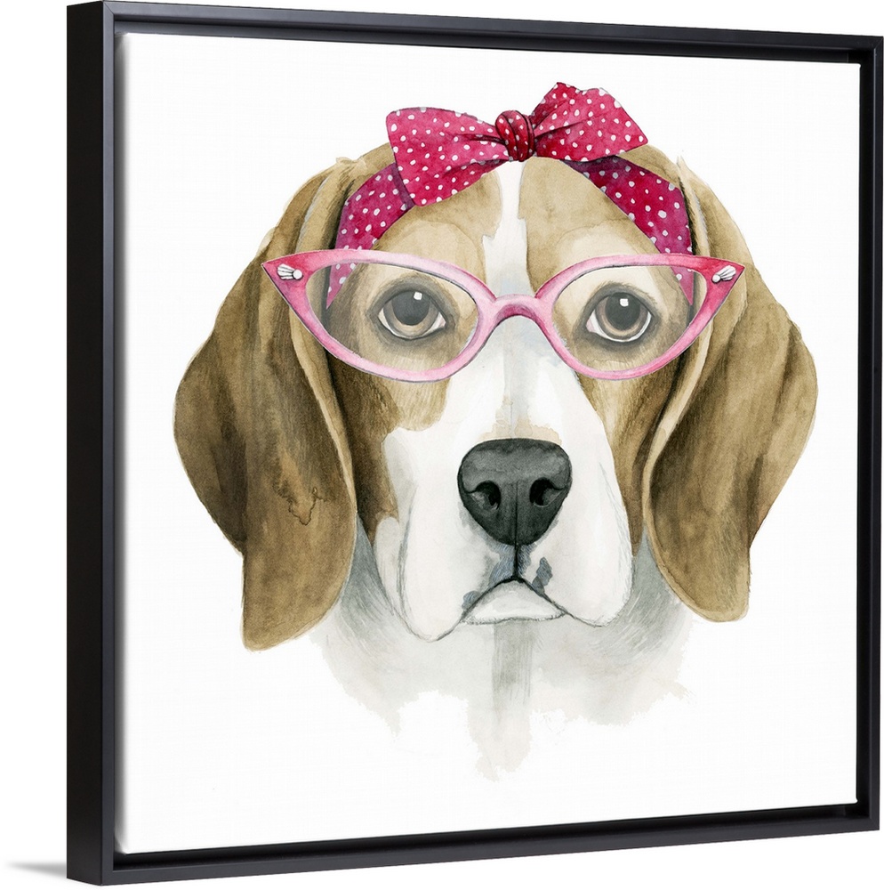 <p>Humorous illustration of a beagle wearing large glasses and a bow.</p>