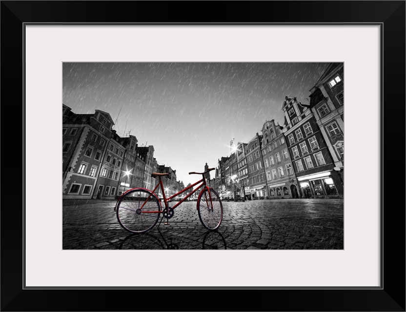 <p>Vintage Red Bike On Cobblestone Historic Wroclaw In Rain, Poland</p>