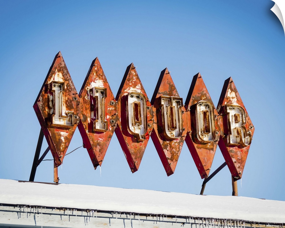 <p>Photograph of mid-century liquor store sign against a blue sky.</p>