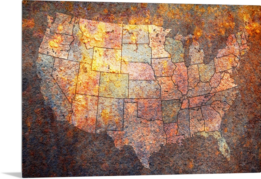 <p>Grungy canvas of a map of the United States of America with the states painted various colors.</p>