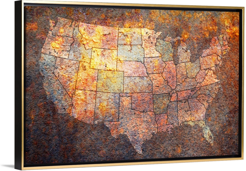 <p>Grungy canvas of a map of the United States of America with the states painted various colors.</p>