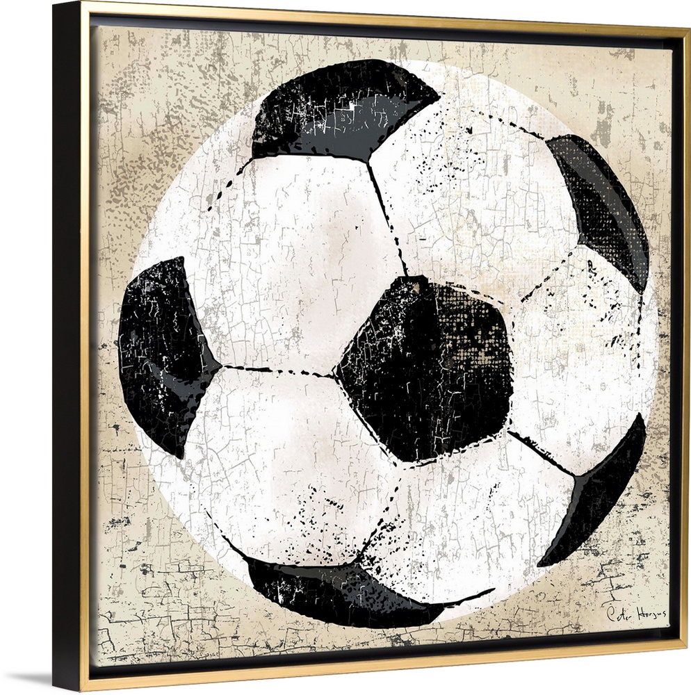 <p>Vintage style wall art of an old distressed soccer ball on tan and sepia background.</p>