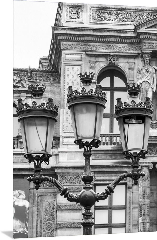 <p>Vintage street lantern detailed close-up in front of Louvre museum, Paris, France. Black and white image.</p>