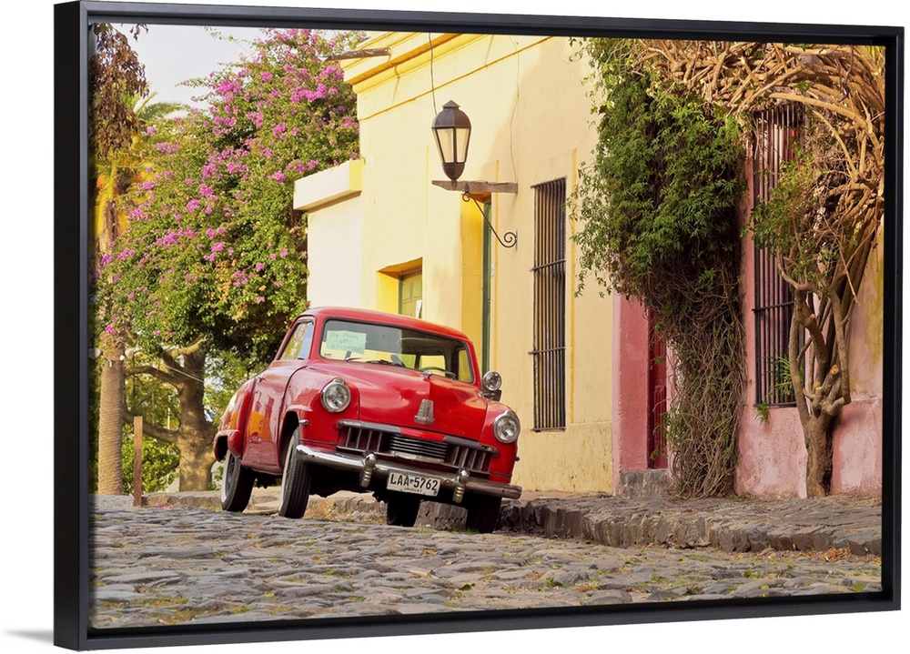 <p>Uruguay, Colonia Department, Colonia del Sacramento, Vintage Studebaker car on the cobblestone lane of the historic quarter.</p>