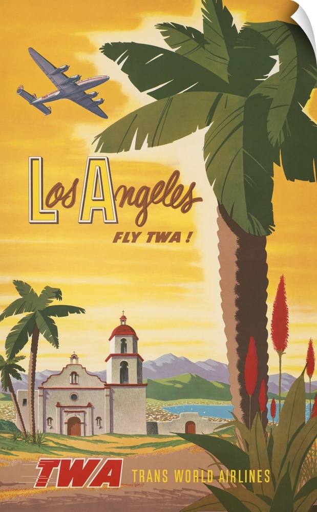 <p>Vintage travel poster, Fly TWA to Los Angeles, shows airplane flying over a Spanish mission church, 1950</p>