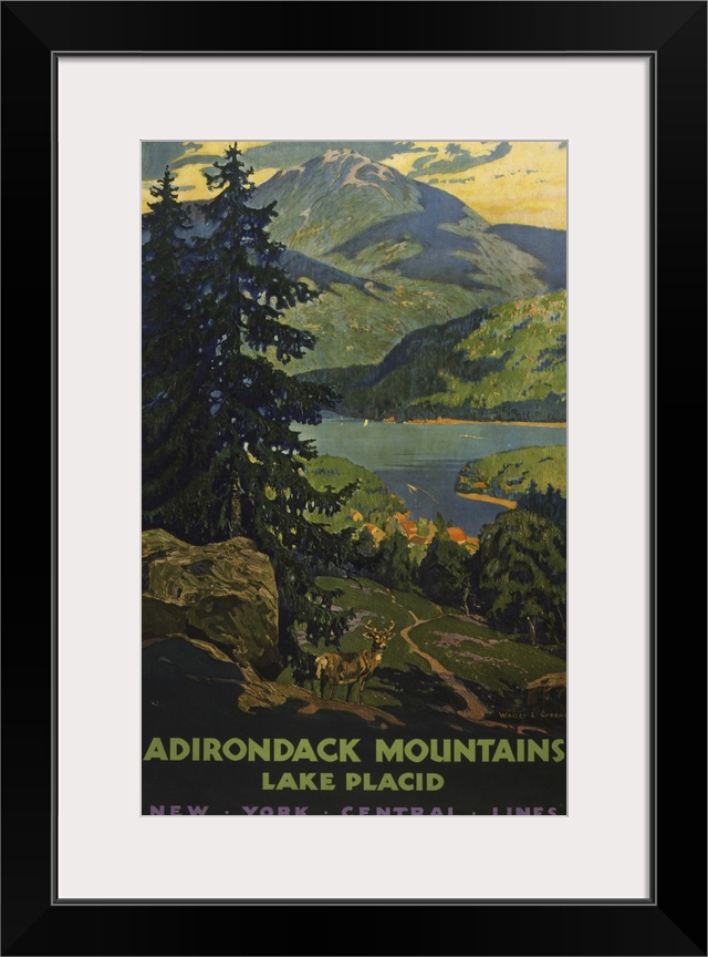 <p>Vintage travel poster for the Adirondack Mountains, of a view of Lake Placid with stag in the foreground, 1920</p>