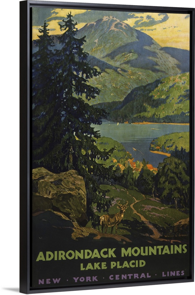 <p>Vintage travel poster for the Adirondack Mountains, of a view of Lake Placid with stag in the foreground, 1920</p>
