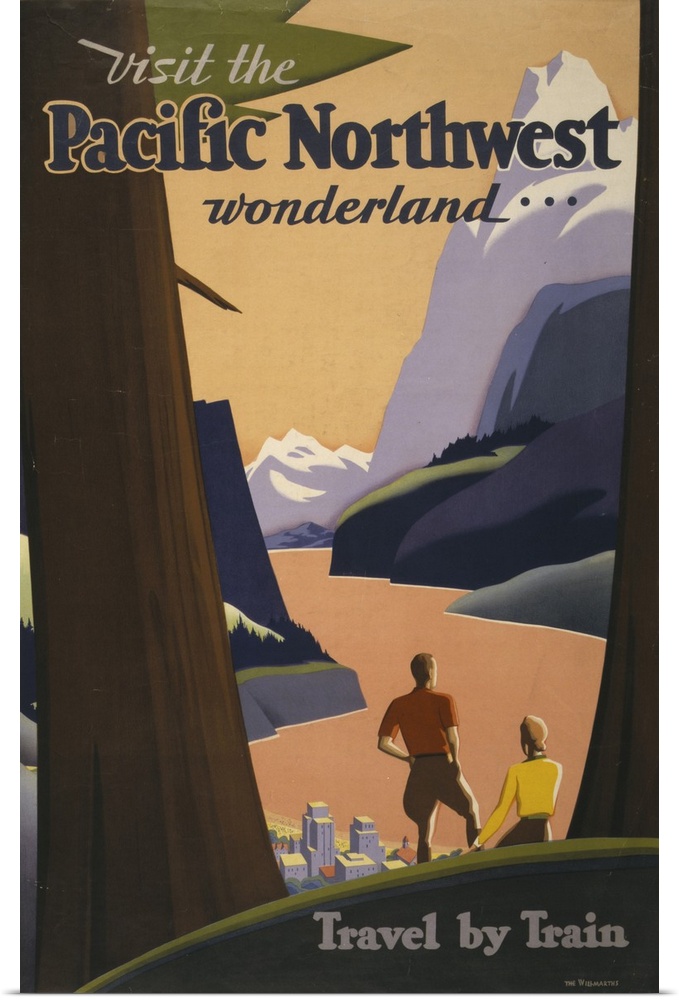 <p>Vintage travel poster of a man and woman looking out over mountains from among redwood trees, 1925</p>