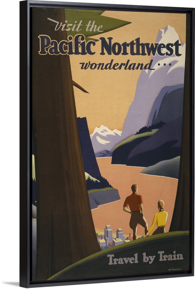 <p>Vintage travel poster of a man and woman looking out over mountains from among redwood trees, 1925</p>