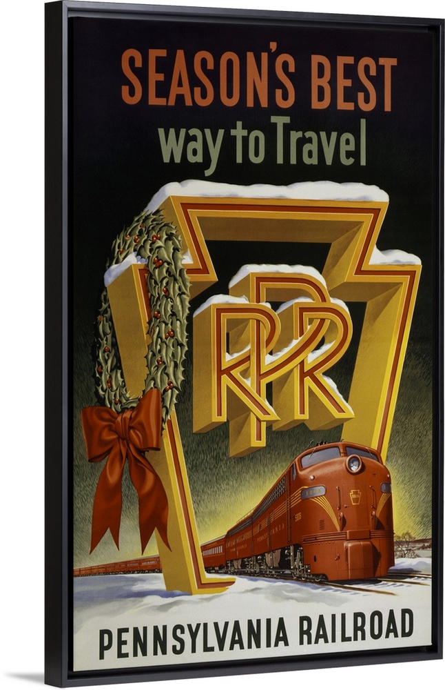 <p>Vintage travel poster of a red train passing through the keystone logo of the Pennsylvania Railroad, 1955</p>