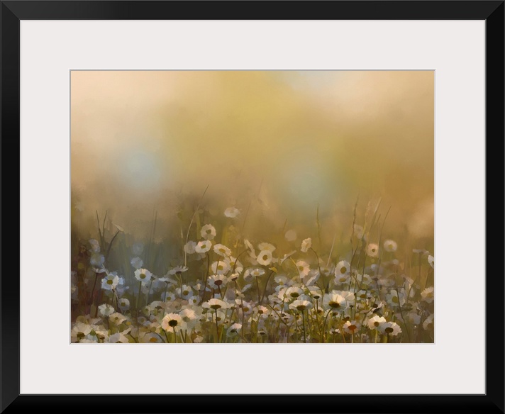 <p>Vintage white daisy flowers in the meadows. Originally an abstract oil painting of a field of daisies at sunset in soft golden brown color and blur style with bokeh background.</p>