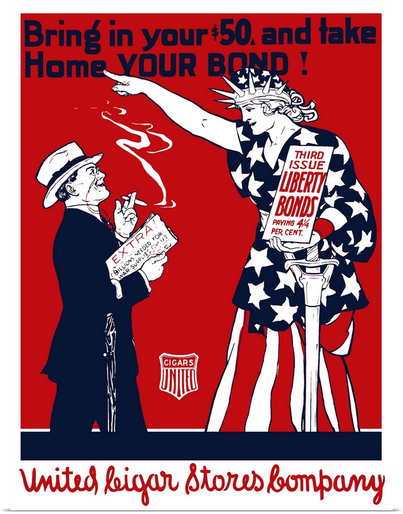 <p>Vintage World War I poster of a man smoking a cigar as Lady Liberty points at him. It reads, Bring in your $50 and take home your bond! Third Issue Liberty Bonds.</p>