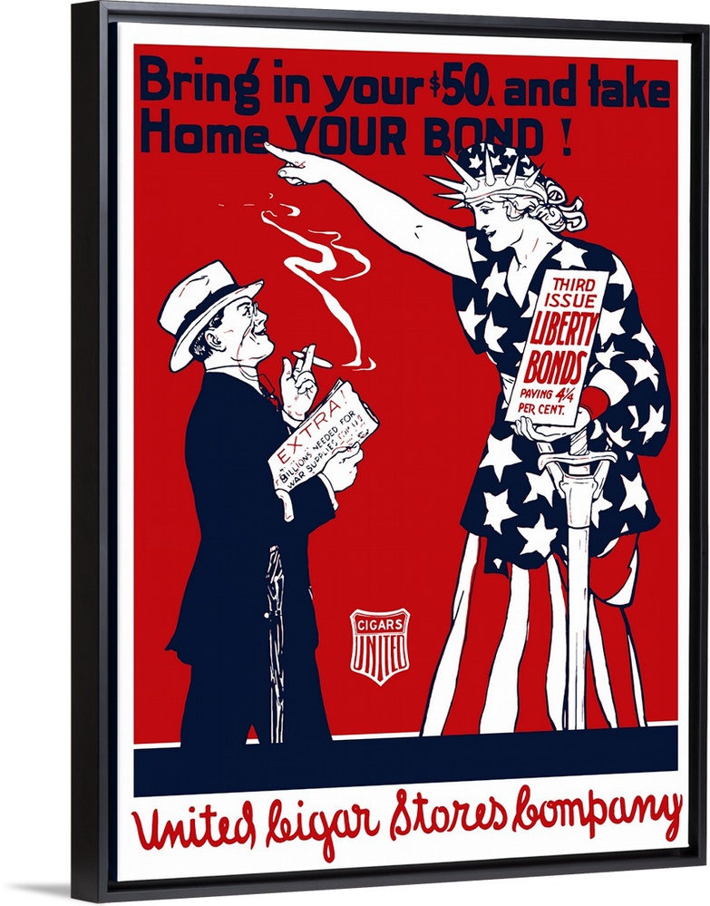 <p>Vintage World War I poster of a man smoking a cigar as Lady Liberty points at him. It reads, Bring in your $50 and take home your bond! Third Issue Liberty Bonds.</p>