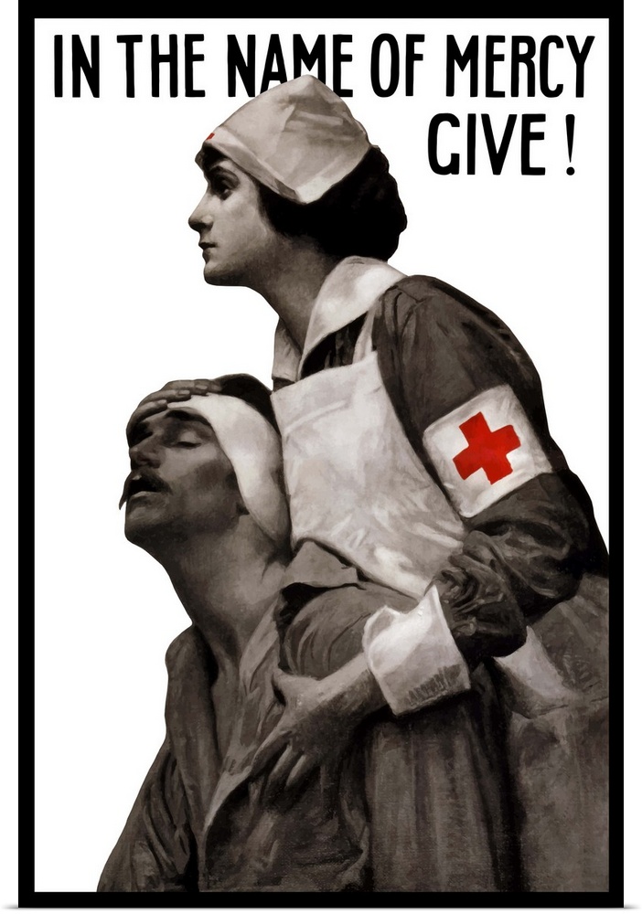 <p>Vintage World War I poster of a Red Cross nurse holding a wounded man. It reads, In the name of mercy give!</p>