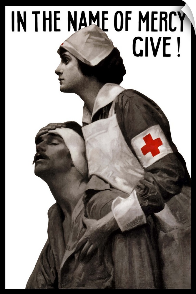 <p>Vintage World War I poster of a Red Cross nurse holding a wounded man. It reads, In the name of mercy give!</p>