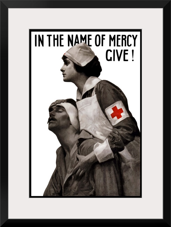 <p>Vintage World War I poster of a Red Cross nurse holding a wounded man. It reads, In the name of mercy give!</p>
