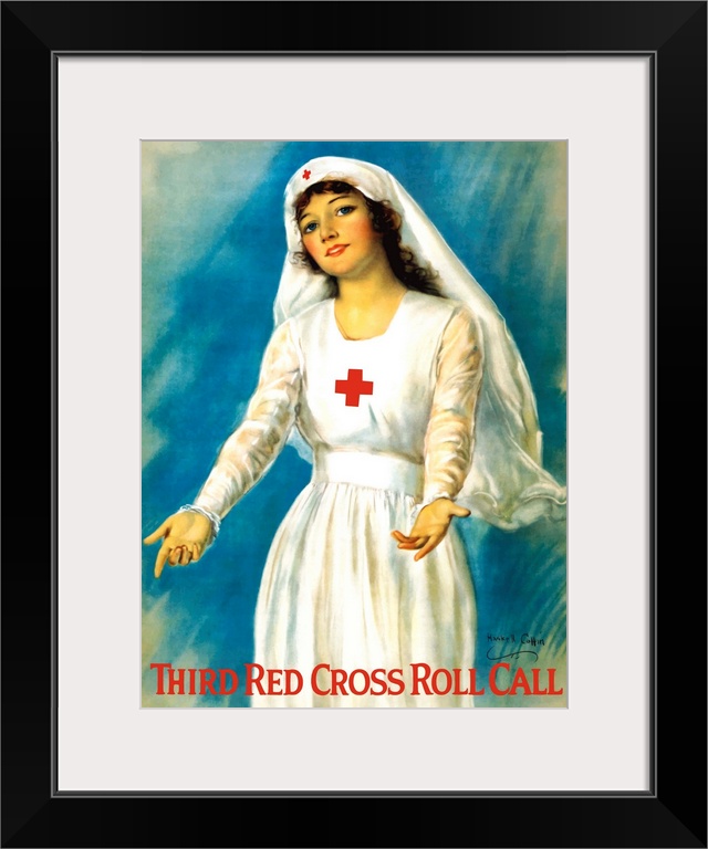 <p>Vintage World War One poster of a Red Cross nurse holding open her arms. It reads, Third Red Cross Roll Call.</p>