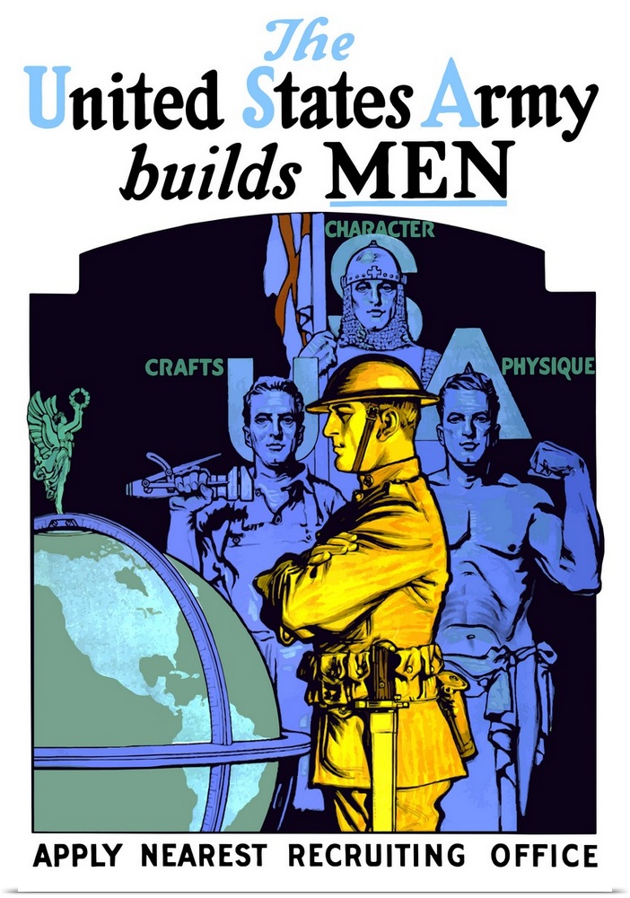 <p>Vintage World War I poster of a soldier looking at a globe. Behind him stand three men representing crafts, character, and physique. It reads, The United States Army Builds Men, Apply Nearest Recruiting Office.</p>