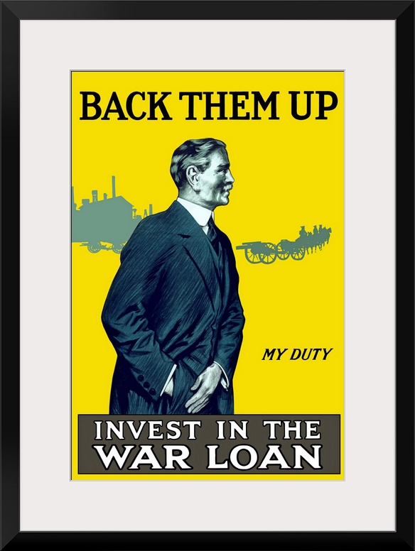 <p>Vintage World War I poster of an older man reaching into his pocket as artillery and soldiers march behind him. It reads, My Duty. Back them up, invest in the war loan.</p>