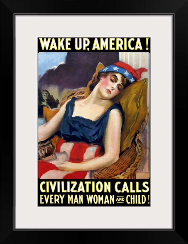 <p>Vintage World War One poster of Lady Liberty sleeping in a chair. It reads, Wake up, America! Civilization calls every man, woman and child!</p>