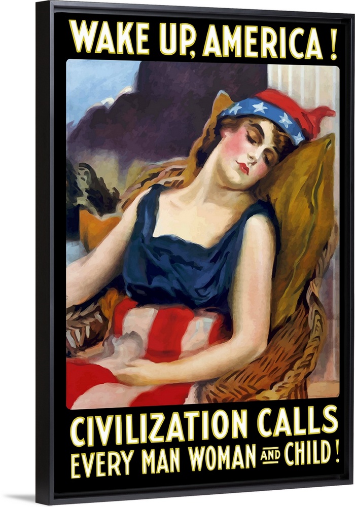 <p>Vintage World War One poster of Lady Liberty sleeping in a chair. It reads, Wake up, America! Civilization calls every man, woman and child!</p>