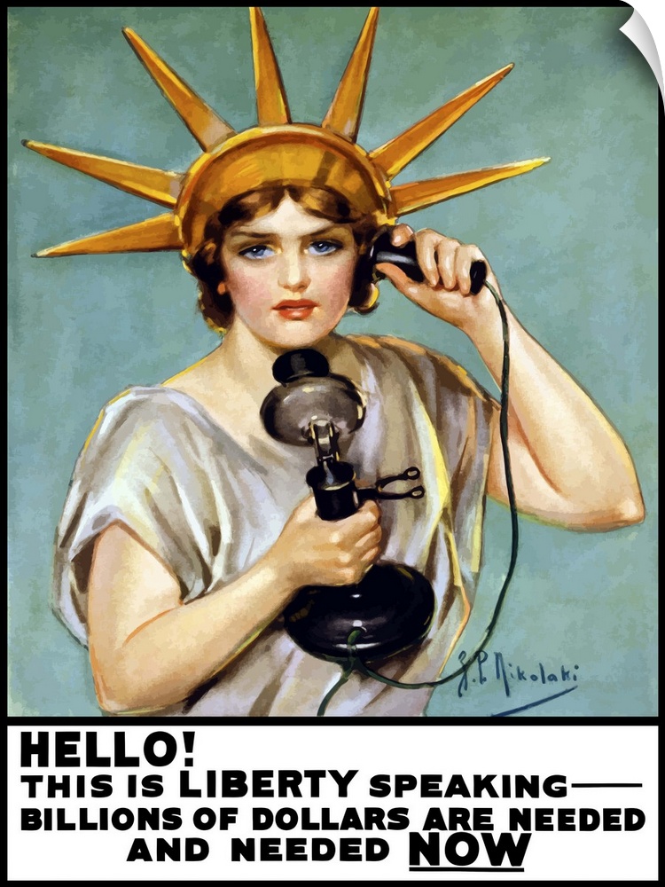 <p>Vintage World War I poster of the Statue of Liberty talking on the telephone. It reads, Hello! This is liberty speaking - Billions of dollars are needed and needed now.</p>