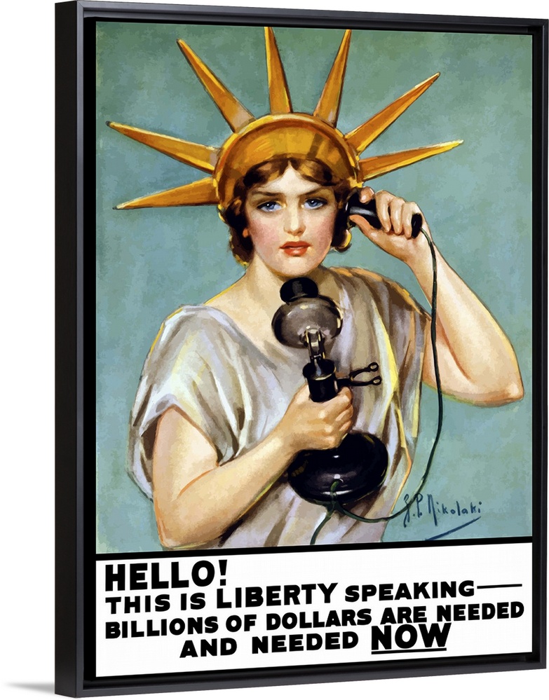 <p>Vintage World War I poster of the Statue of Liberty talking on the telephone. It reads, Hello! This is liberty speaking - Billions of dollars are needed and needed now.</p>