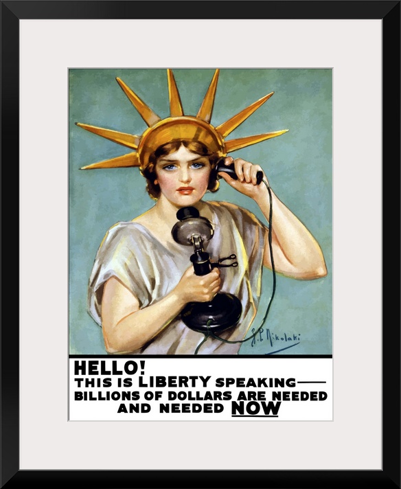 <p>Vintage World War I poster of the Statue of Liberty talking on the telephone. It reads, Hello! This is liberty speaking - Billions of dollars are needed and needed now.</p>