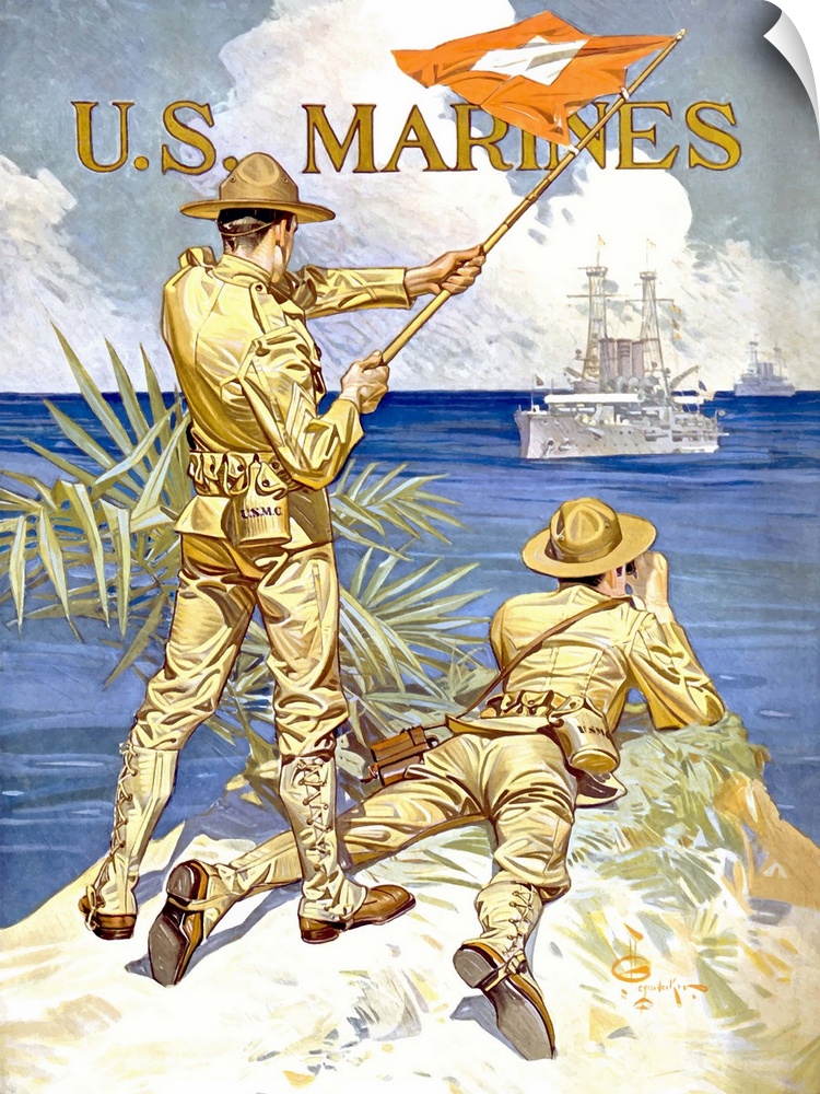 <p>Vintage World War One poster of two marines signaling a ship with a flag. It reads, U.S. Marines.</p>
