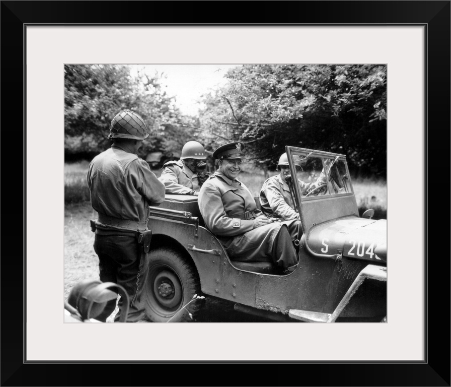 <p>Vintage World War II photo of General Dwight D. Eisenhower sitting in a jeep talking with other officers.</p>
