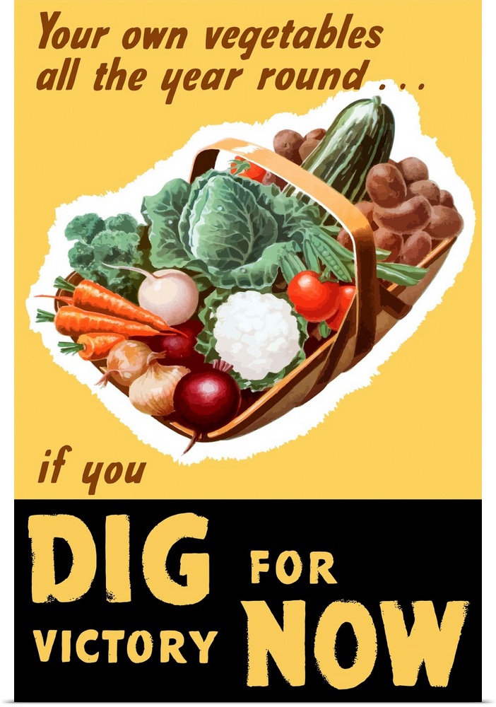 <p>Vintage World War II poster of a basket filled with fresh vegetables. It reads, Your own vegetables all the year round... if you Dig For Victory Now.</p>
