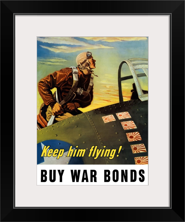 <p>Vintage World War II poster of a fighter pilot climbing into his airplane. It reads, Keep him flying! Buy War Bonds.</p>