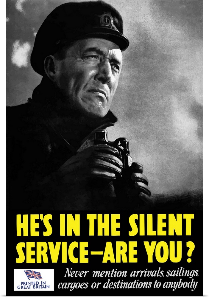 <p>Vintage World War II poster of a naval officer holding binoculars while on the lookout. It declares, He's in the silent service - are you? Never mention arrivals, sailings, cargoes or destinations to anybody. Printed in Great Britain.</p>