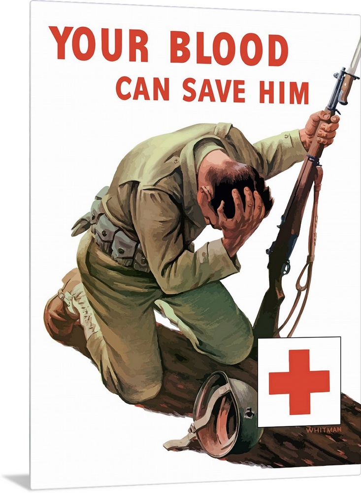 <p>Vintage World War II poster of a soldier kneeling and holding his head, his helmet lays beside him pierced with a bullet hole. It also has a large red cross. It declares - Your Blood Can Save Him.</p>