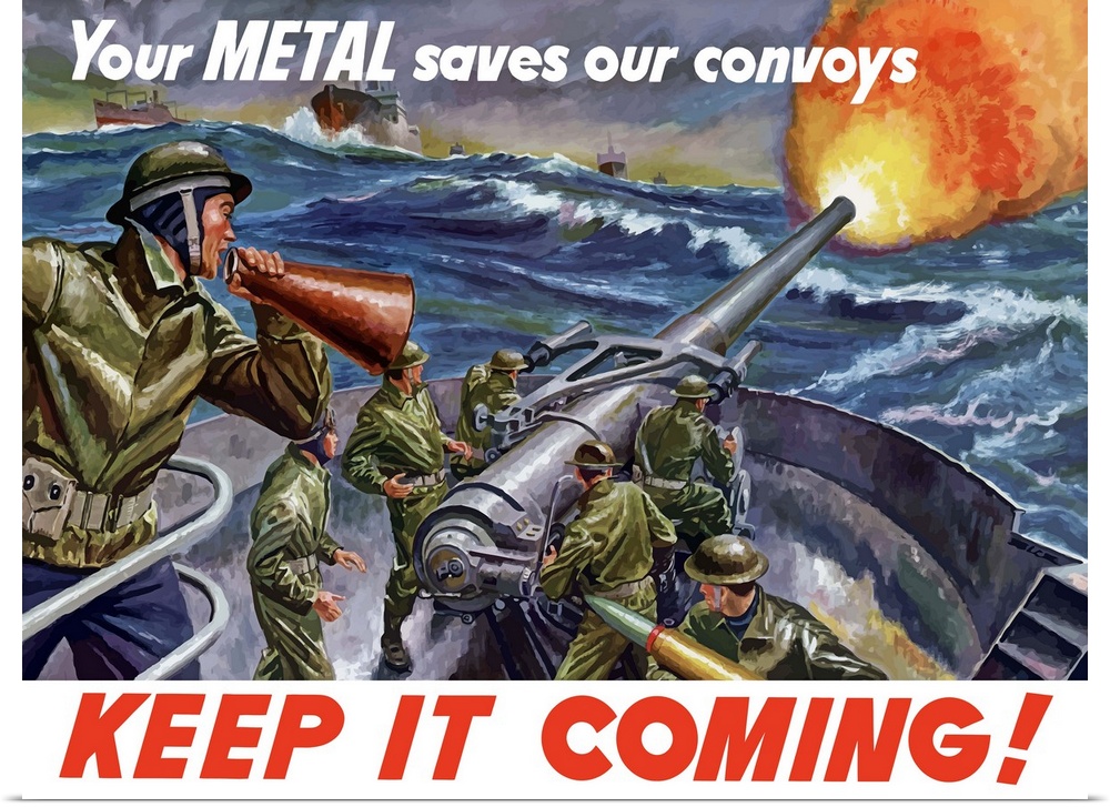 <p>Vintage World War II poster of ships at sea, firing artillery rounds into the distance. It declares - Your Metal Saves Our Convoys, Keep It Coming!</p>