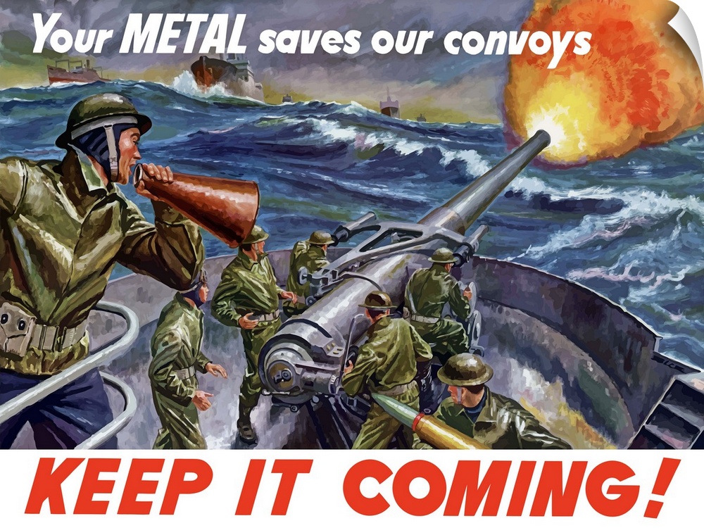 <p>Vintage World War II poster of ships at sea, firing artillery rounds into the distance. It declares - Your Metal Saves Our Convoys, Keep It Coming!</p>
