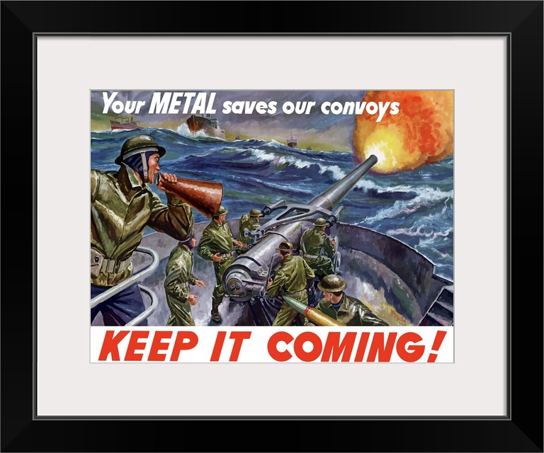 <p>Vintage World War II poster of ships at sea, firing artillery rounds into the distance. It declares - Your Metal Saves Our Convoys, Keep It Coming!</p>
