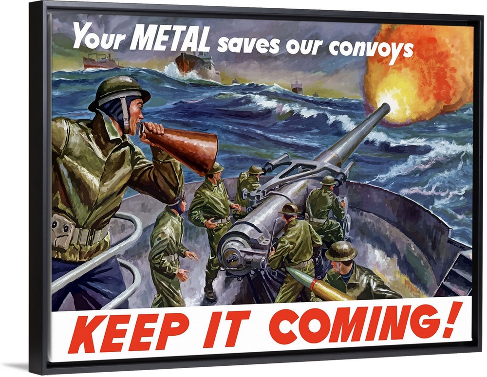 <p>Vintage World War II poster of ships at sea, firing artillery rounds into the distance. It declares - Your Metal Saves Our Convoys, Keep It Coming!</p>