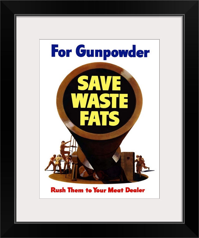 <p>Vintage World War II poster of soldiers running a large artillery gun. It reads, For Gunpowder Save Waste Fats, Rush Them To Your Meat Dealer.</p>