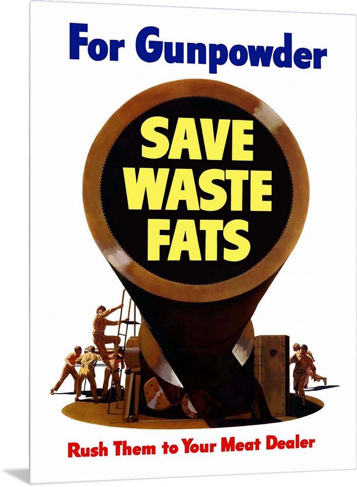 <p>Vintage World War II poster of soldiers running a large artillery gun. It reads, For Gunpowder Save Waste Fats, Rush Them To Your Meat Dealer.</p>