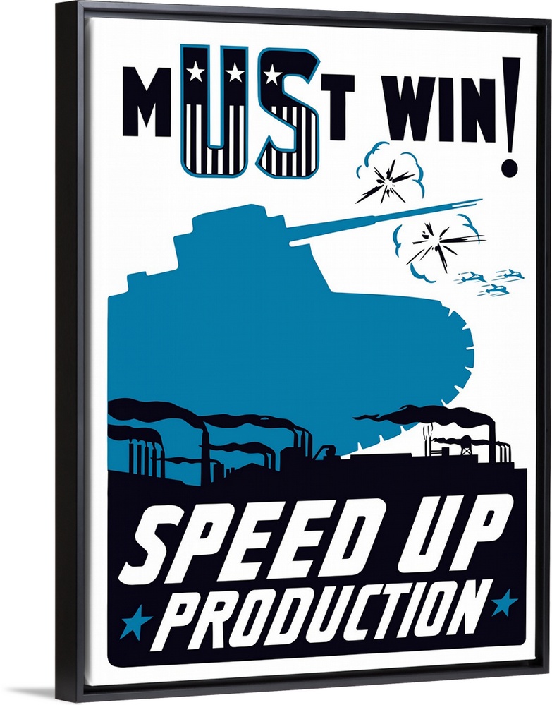 <p>Vintage World War II propaganda poster featuring a factory, a tank, and airplanes flying in the sky. It reads, Must Win! Speed Up Production.</p>