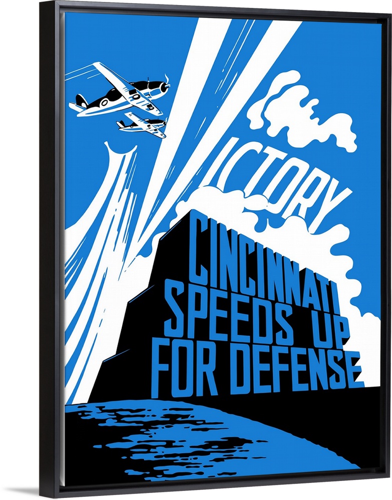 <p>Vintage World War II propaganda poster featuring two fighter planes flying over the ocean as the clouds spell out, Victory. It reads, Victory, Cincinnati Speeds Up For Defense.</p>