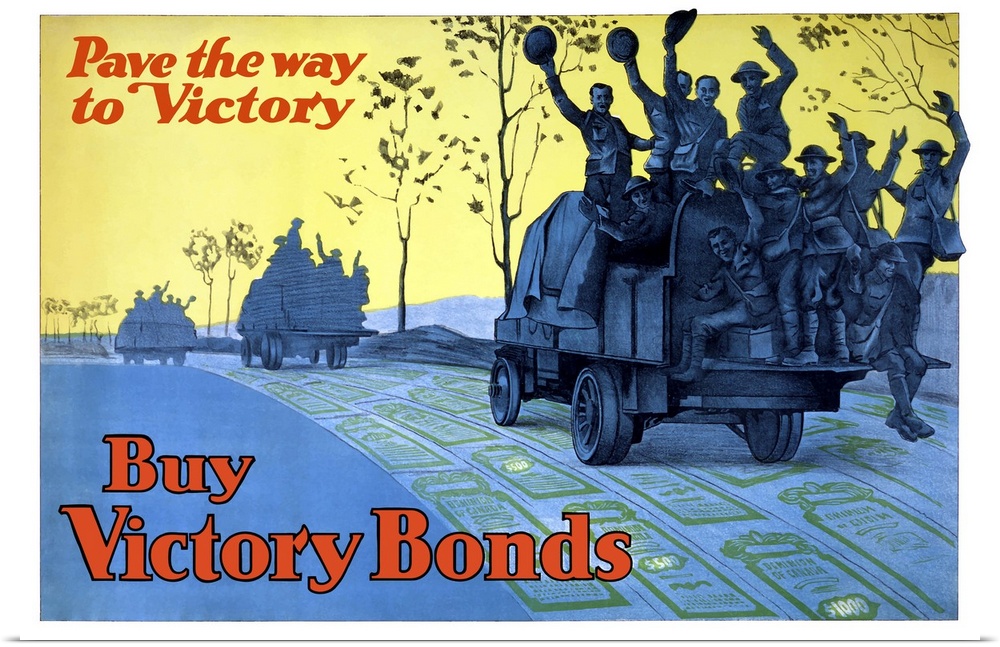 <p>Vintage World War One poster of a truck full of soldiers driving on a road paved with victory bonds. It reads, Pave the way to Victory, Buy Victory Bonds.</p>