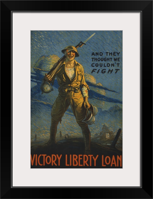 <p>Vintage WWI military propaganda poster of a wounded American soldier on the battlefield, carrying several German helmets.</p>
