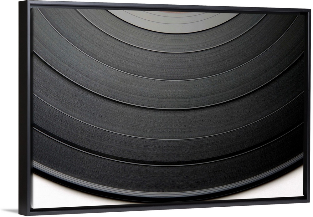 <p>This is musical decorative art that is a horizontal photograph that is a close up detail of a record against a blank backdrop.</p>