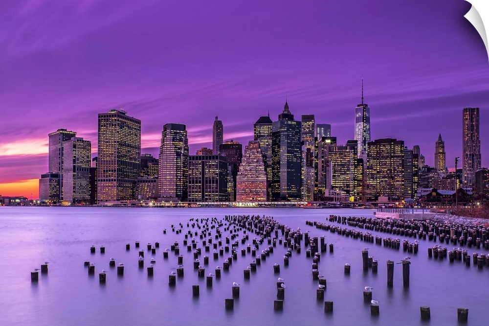 <p>Manhattan skyline at sunset under a purple sky, seen from Brooklyn.</p>