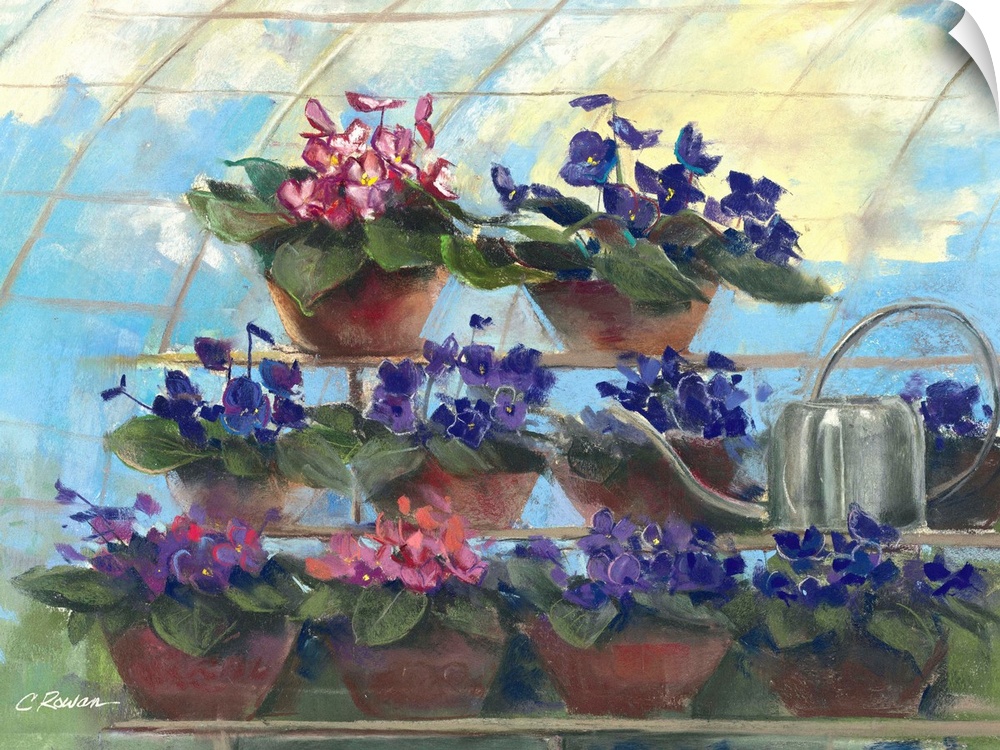 <p>Contemporary painting of potted flowers in a greenhouse.</p>