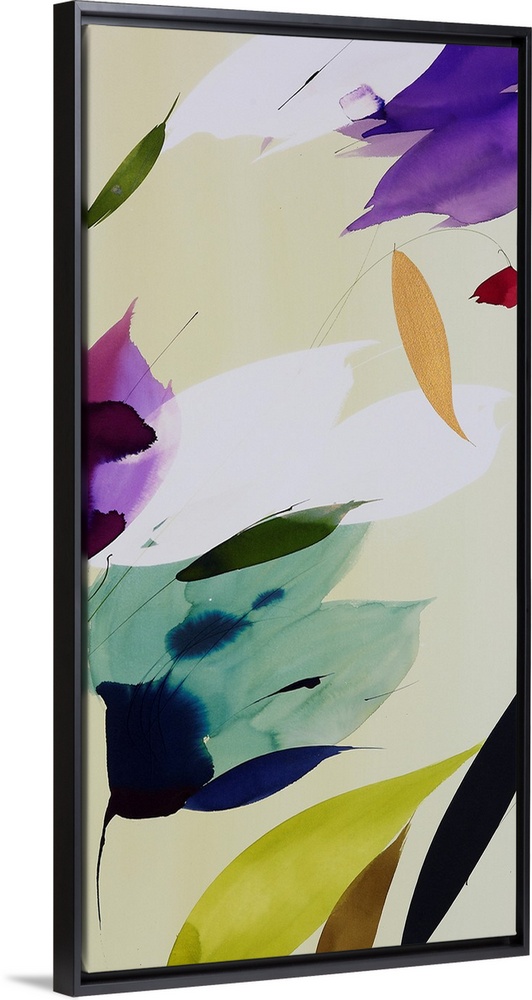 <p>A long vertical painting in a modern design of flowers in purple and green tones.</p>