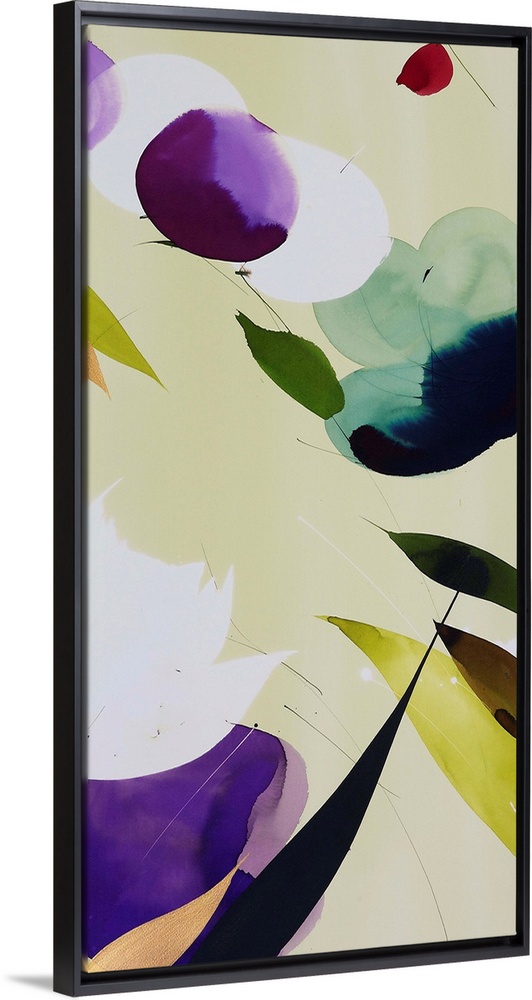 <p>A long vertical painting in a modern design of flowers in purple and green tones.</p>