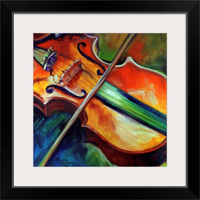 <p>Square painting of a violin close-up with the bow resting across it on a blue and green background.</p>